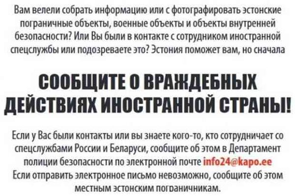 КаПо напоминает, что «любое содействие и контакты со спецслужбами иностранных государств, в том числе России и Беларуси, является уголовно наказуемым преступлением». Также уголовно наказуемым преступлением является «предоставление представителям России и Беларуси информации о пограничных объектах, военных объектах и объектах внутренней безопасности Эстонской Республики».