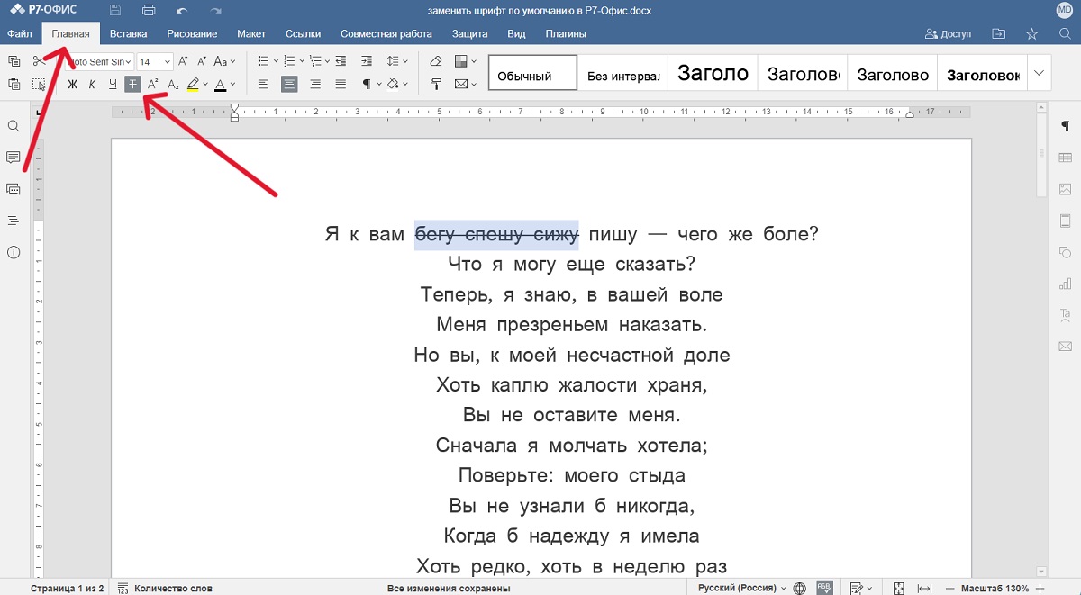 Для того чтобы в документе зачеркнуть слово или часть текста, следует выделить  текстовыйфрагмент. Затем в верхней панели выбрать вкладку «Главная» и нажать на кнопку с пиктограммой в виде перечеркнутой буквы Т. После этого выбранный текст будет зачеркнут. По этой инструкции можно использовать функцию зачеркивания текста не только в текстовом редакторе, но и в редакторах таблиц и презентаций «Р7-Офис».