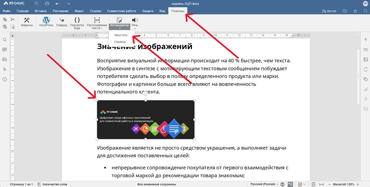 Чтобы перейти в режим редактирования, надо выделить рисунок или фотографию в документе и в верхней панели открыть вкладку «Плагины». Далее нажать на кнопку «Фоторедактор», а в выпадающем меню выбрать «Запустить».