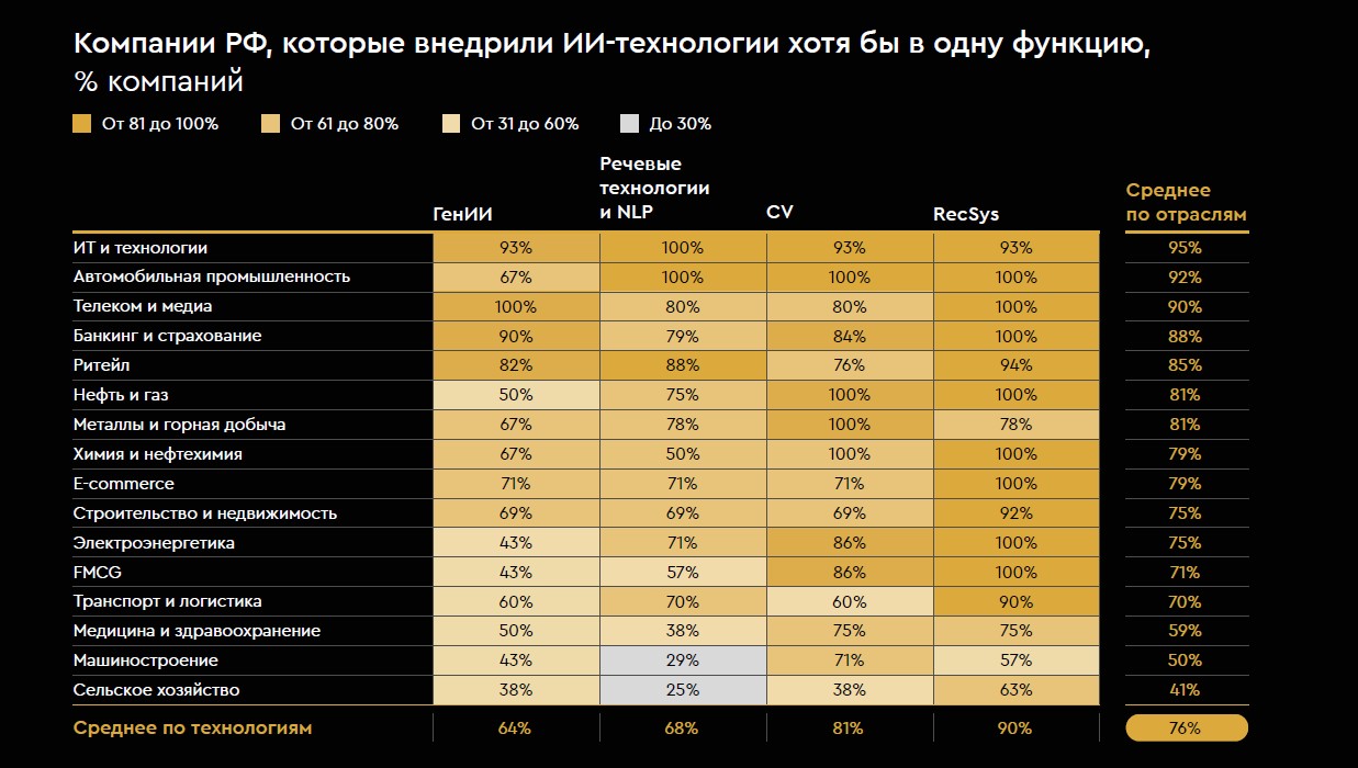 В отчете эксперты детально проанализировали четыре ключевые технологии: генеративный ИИ с акцентом на ИИ-агентах, обработку естественного языка (NLP) и речевые технологии, компьютерное зрение (CV), рекомендательные системы (RecSys). В технологическом разрезе наиболее значимый вклад вносят генеративный ИИ и компьютерное зрение, в отраслевом — наибольшая эффективность наблюдается в digital-ориентированных сферах: e-commerce, телекоммуникациях, медиа, а также в ИТ и технологиях, отмечается в отчете.