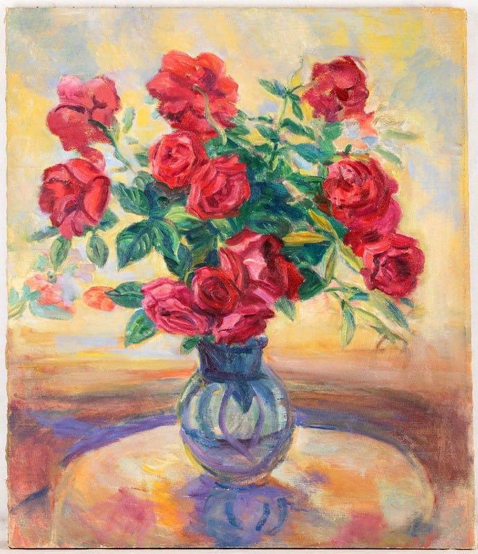 «Пионы в вазе» (холст, масло, 84 × 71,5 см) — натюрморт, где цвет — не просто средство выразительности, а главная тема. Сочные, алые лепестки, выполненные в насыщенной колористике, и фон, выстроенный на тончайших оттенках — от жёлтого до сиреневого — создают богатую живописную ткань. Это живопись, в которой форма лепится цветом, а объём рождается из внутреннего напряжения.