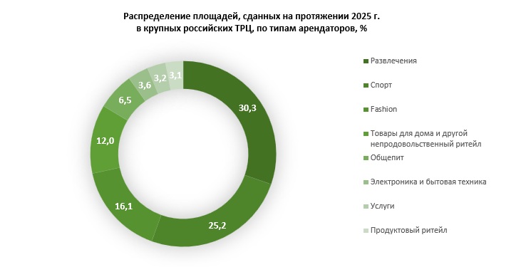 В докризисном 2019-м году магазины одежды, обуви, аксессуаров и брендовой бижутерии закрывали от 52% до 56% всех арендопригодных площадей. Но череда кризисов привели к тому, что спустя пять лет их представительство сузилось до 24,6%. В 2025-м тренд на замещение fashion проектов продолжился. Он потерял еще 5,5 процентного пункта. При этом развлекательные и досуговые форматы в уходящем году дополнительно набрали 4,8 процентного пункта. Если обратить внимание на структуру арендных сделок, заключенных за последние 12 месяцев, то окажется, что 30,3% сданного метража приходится на долю развлечений. Fashion-профиль отмечен у 22% новых арендаторов, но они арендовали только 16,1% площадей. Еще более выраженная диспропорция наблюдается в непродуктовом ритейле: он обеспечивает треть всей аудитории и всего 12,0% реализации.